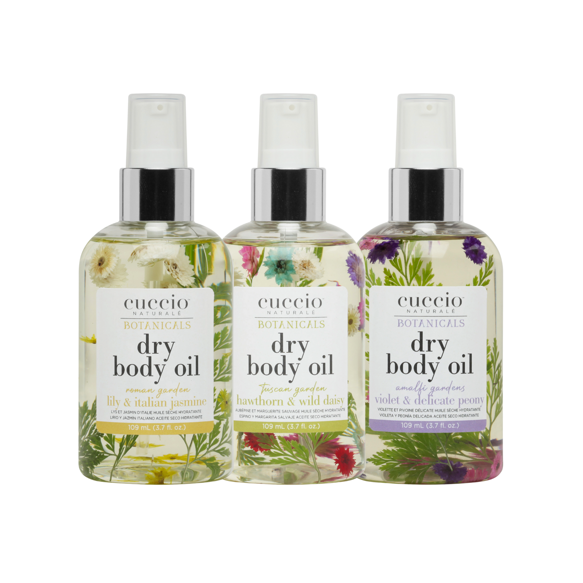 Tuscan Garden: Helianthus Annuus (Sunflower) Seed Oil, Ethylhexyl Palmitate, Simmondsia Chinensis (Jojoba) Seed Oil, Crataegus Monogyna (Hawthorn) Fruit Extract, Bellis Perennis (Daisy) Flower Extract, Tocopheryl Acetate (Vitamin E Acetate), Parfum (Fragrance). Added in for decorative purposes not part of formula: Anaphalis sinica hance (Pearly Everlasting) Flower, Odontosoria Chinensis (Lace Fern) Fern Plant.